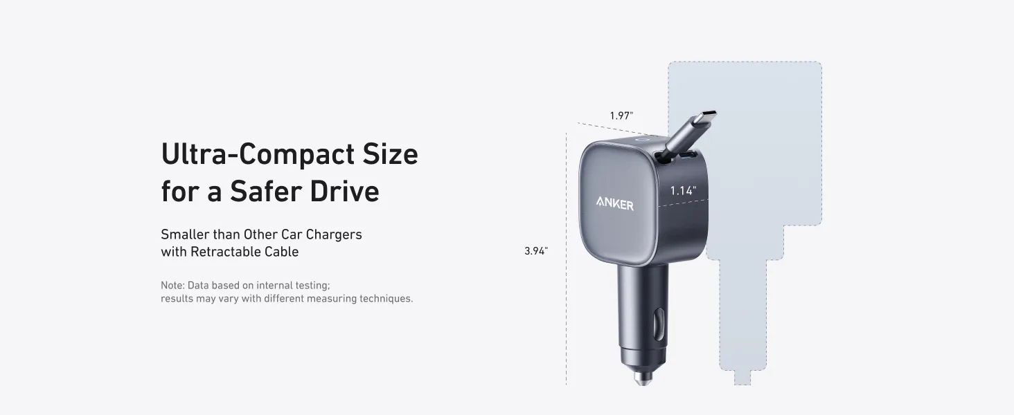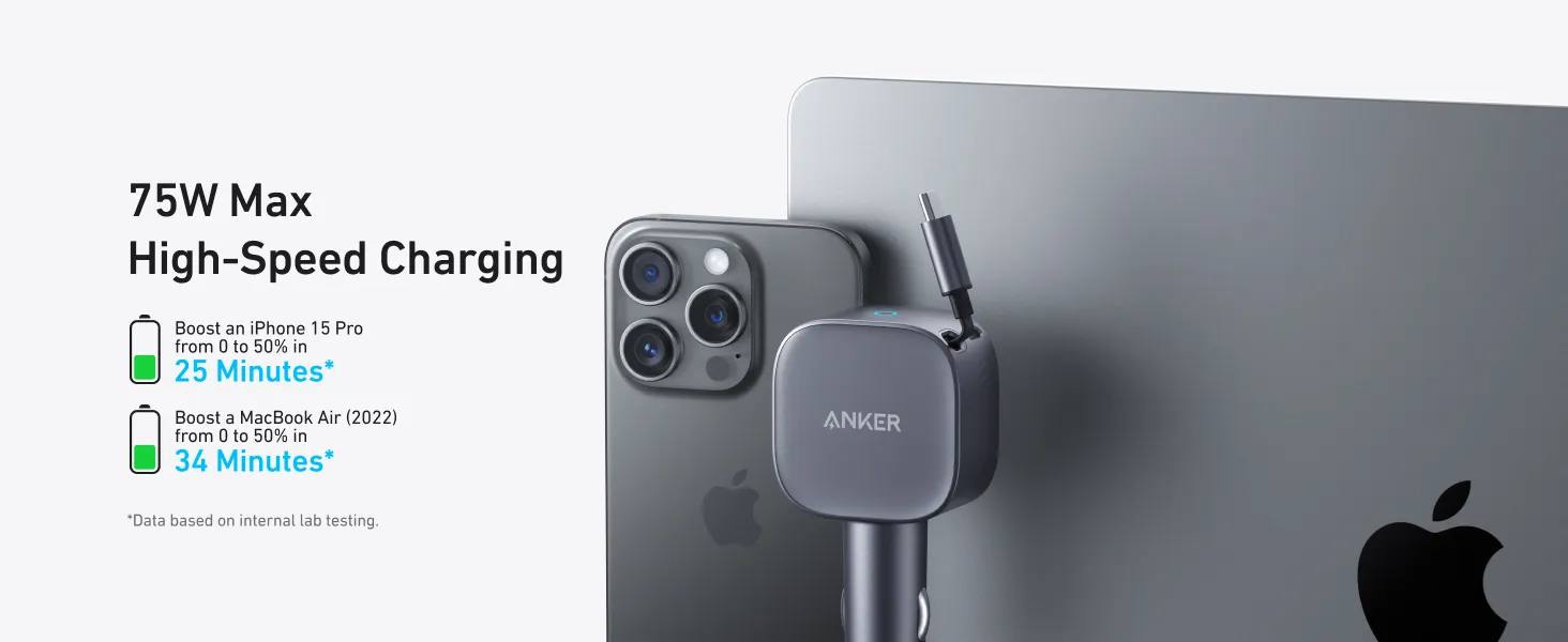 The Anker Nano 75W Car Charger is engineered to eliminate cable mess while providing maximum charging speed.3