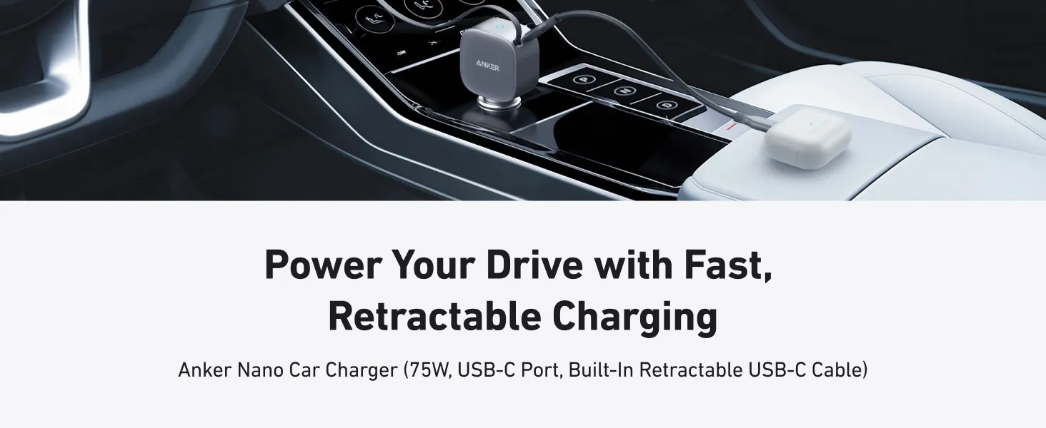 The Anker Nano 75W Car Charger with a built-in retractable USB-C cable (Model: A2738) is the ideal in-car accessory for high-speed, clutter-free power delivery.1 Designed for ultimate convenience, this ultra-compact charger delivers a powerful 75W total output, ensuring that laptops, tablets, and smartphones are charged quickly and safely on the road.2