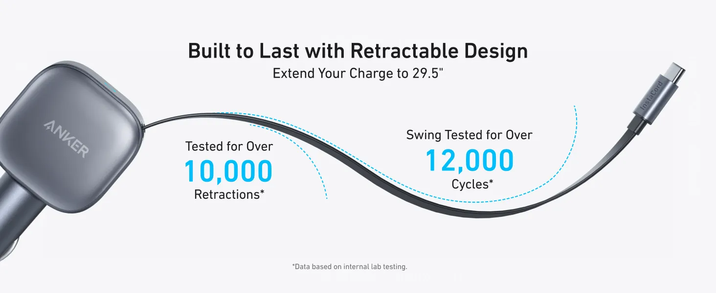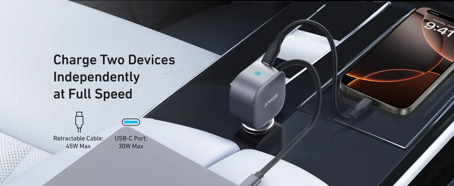 - Integrated Retractable USB-C Cable: Features a built-in, flat USB-C cable that extends up to 75cm (29.5 inches) and neatly retracts with a simple tug, keeping your car organized and tidy.4 This is the standout feature for the Anker A2738.