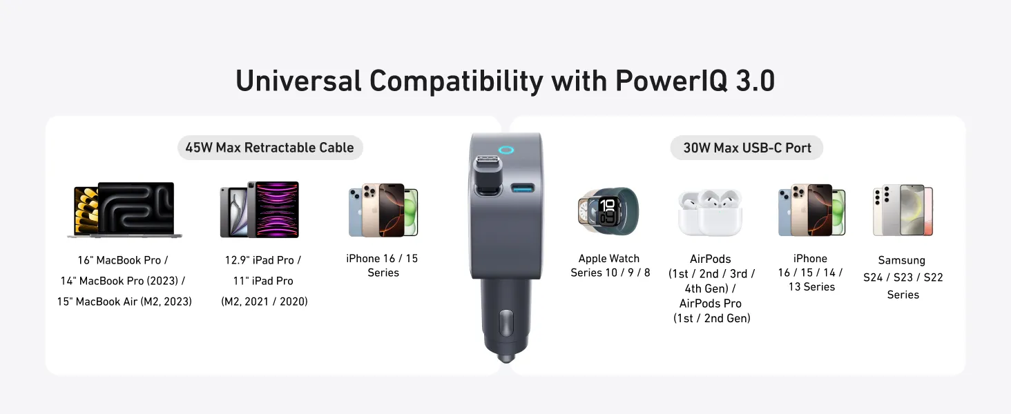 - Universal Compatibility: Supports fast charging for a wide range of devices, including the latest iPhone 15 series, MacBook Pro/Air, iPad, Samsung Galaxy phones (including Super Fast Charging via PPS), Google Pixel, and more.9