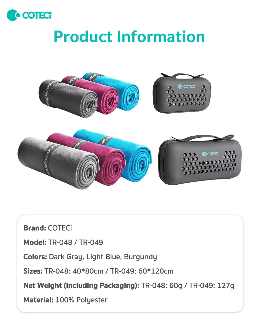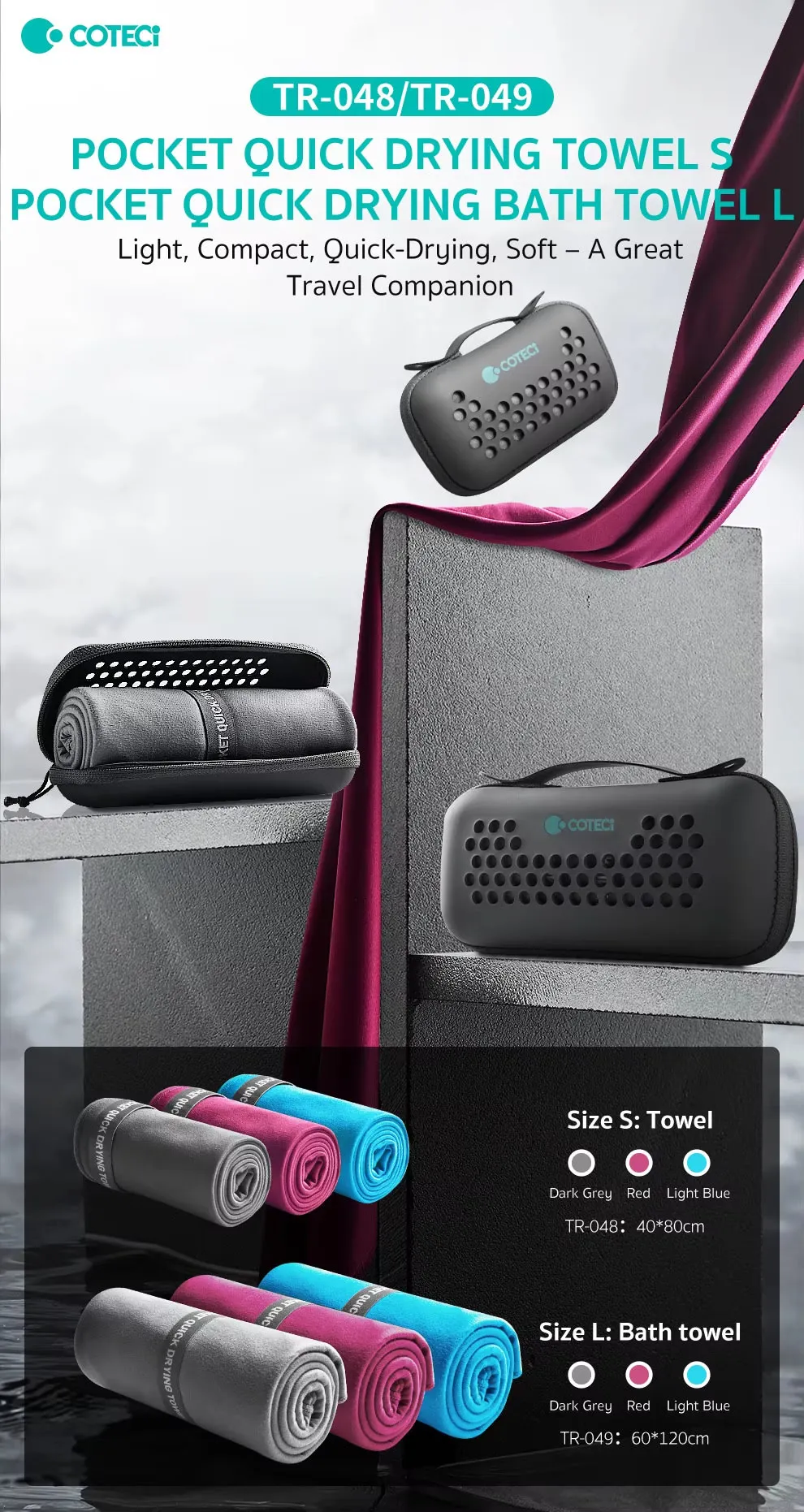 The Coteci Pocket series (Models TR-048 and TR-049) is engineered for high-performance mobility. Unlike standard towels that take hours to dry and occupy half your bag, this ultra-lightweight microfiber towel can be wrung out and reused in minutes. Its “pocket” designation isn’t just a name—it literally packs down small enough to fit into the palm of your hand or a small side pocket of your luggage.