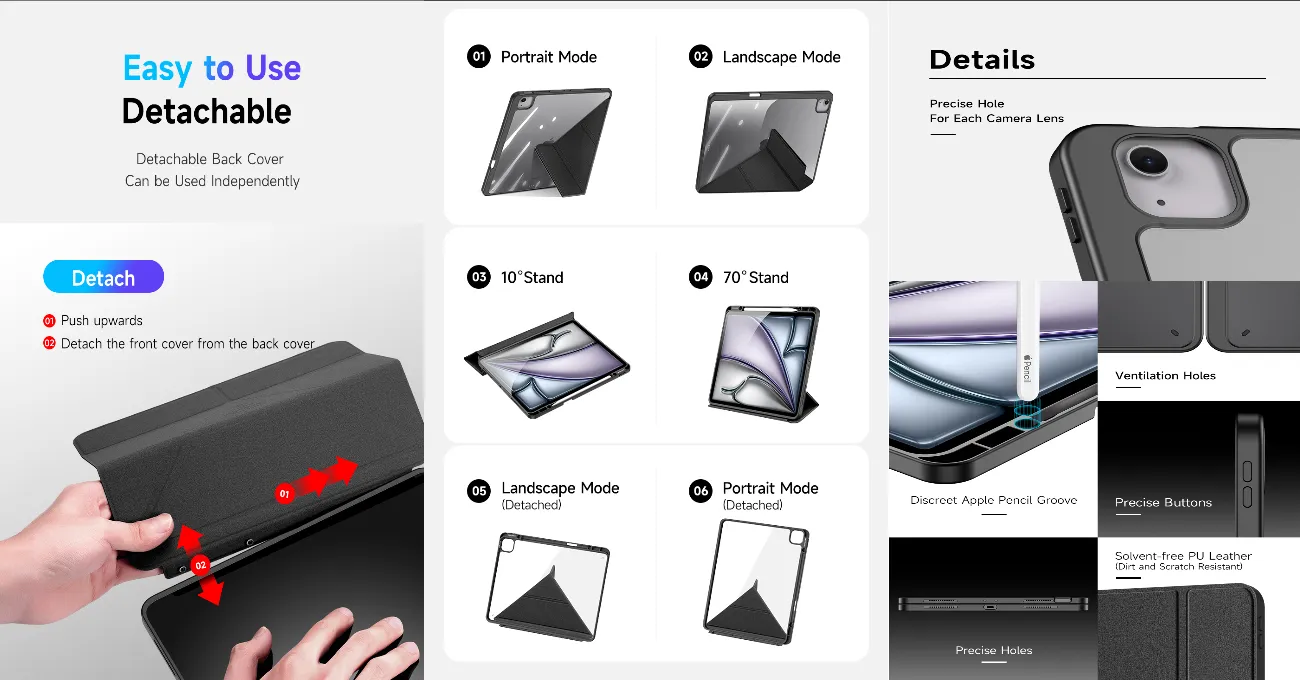 Detachable Magnetic Cover: The front flap is easily removable. Keep it on for full protection and stand functionality, or snap it off to enjoy a thinner, lighter back-only experience.