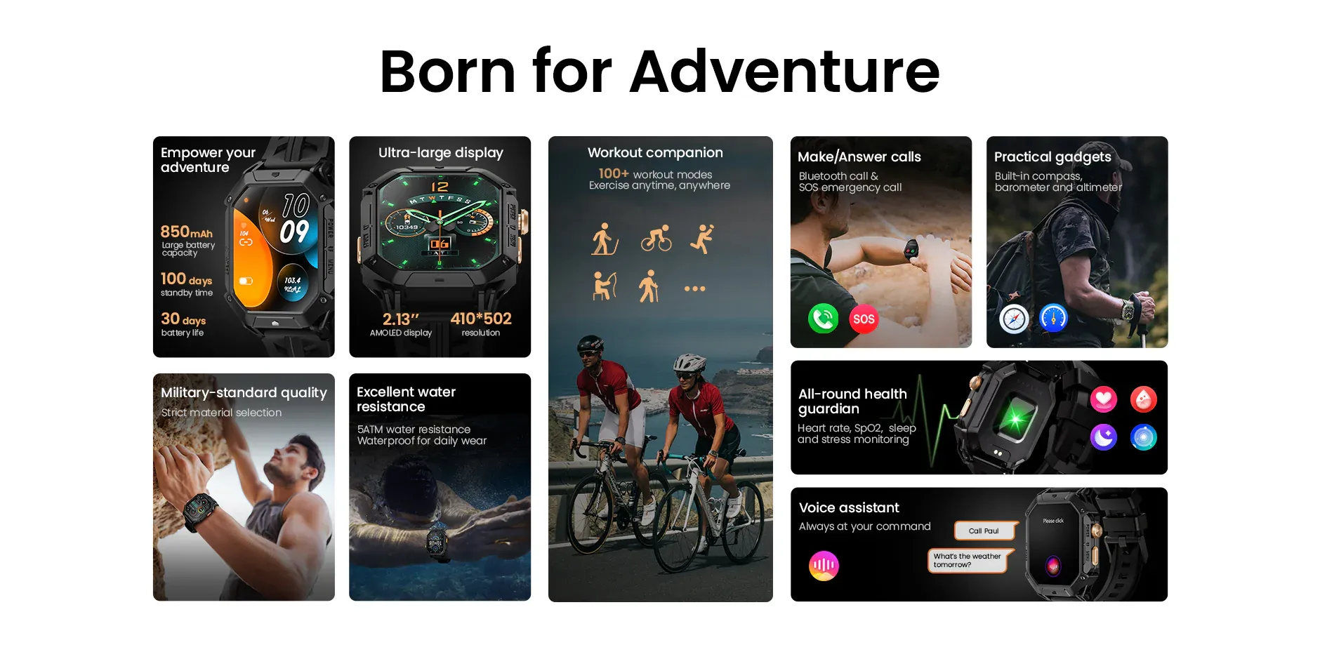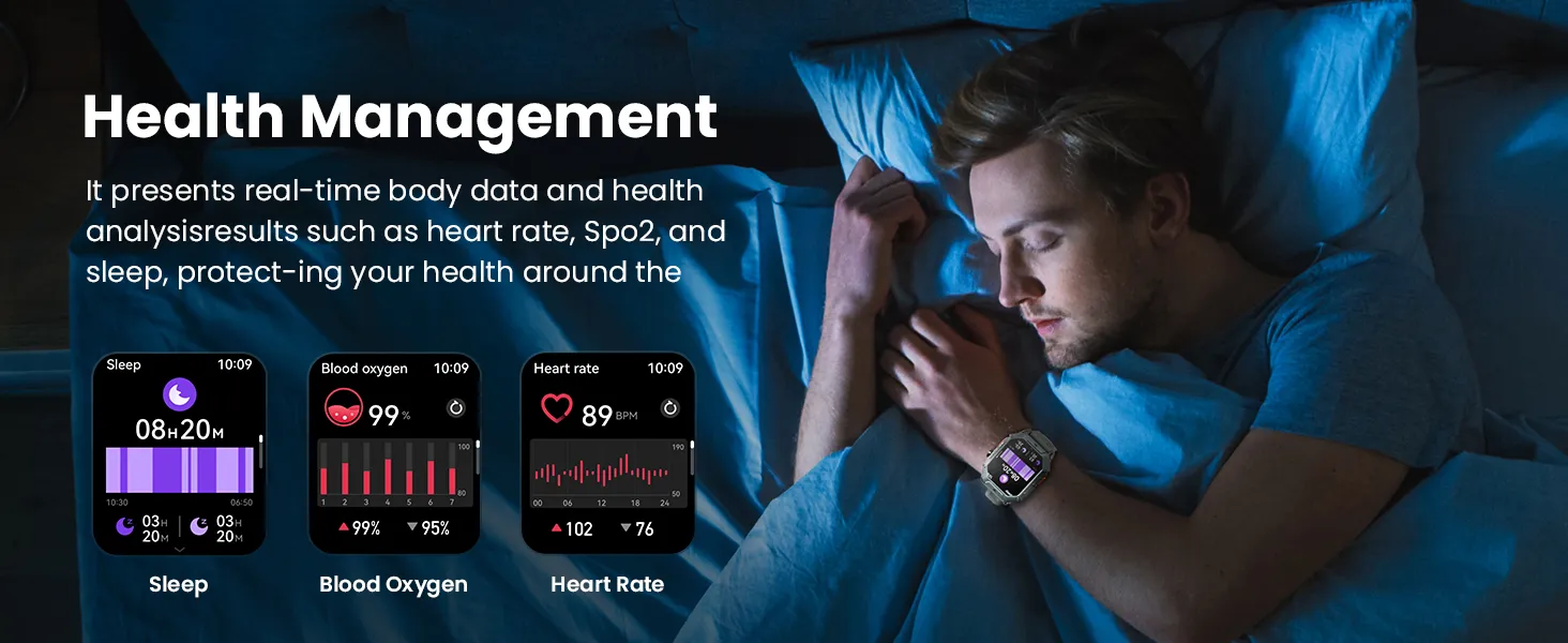 • Health Tracking: Heart rate, SpO2, sleep monitor