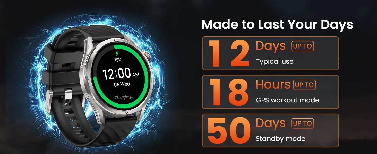 The battery lasts up to 12 days on typical usage and longer in power-saving mode.