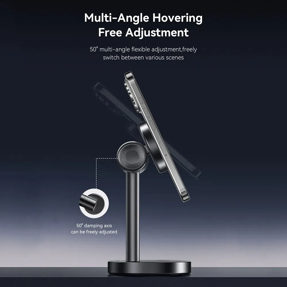 The magnetic phone stand features a robust 50° Damping Hinge, allowing you to effortlessly tilt the phone to your preferred viewing angle for video calls, media, or utilizing iOS StandBy mode.9 The stand is constructed from premium Aluminum Alloy, PC, and ABS V0 fire-retardant materials for superior durability and safety.10