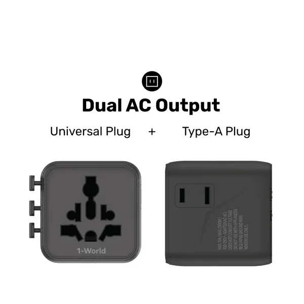With our 1-World Travel Charger, you get a standard US outlet plus a universal socket that accepts plugs from various countries like the UK, AU, EU, and even China. Power up all your devices without the fuss of finding the right charger.