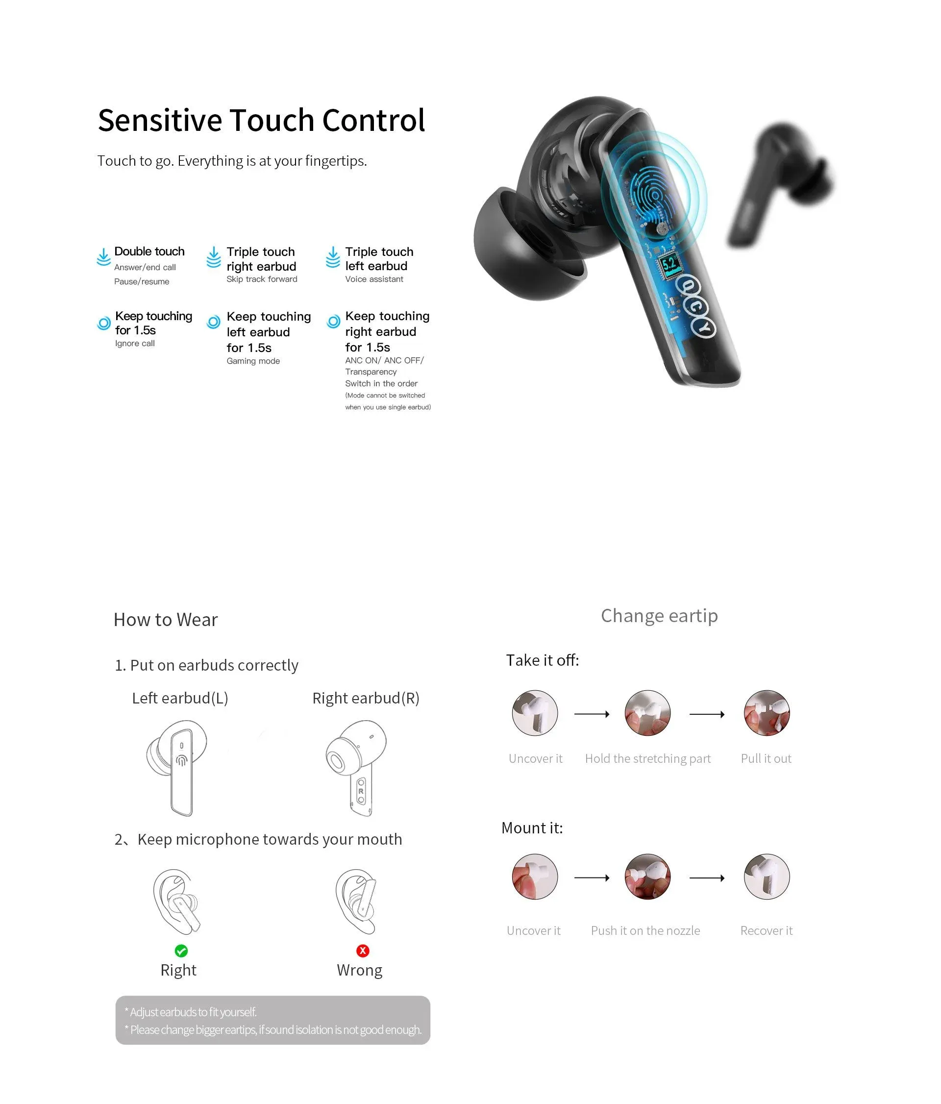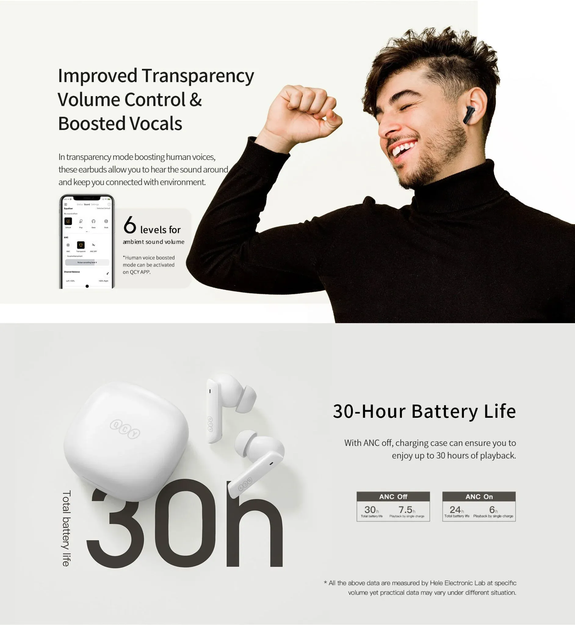 A: You can usually switch between ANC On, Transparency Mode, and Normal Mode by pressing and holding the touch panel on the right earbud.13 The QCY app also allows for customization of the ANC levels and modes.14