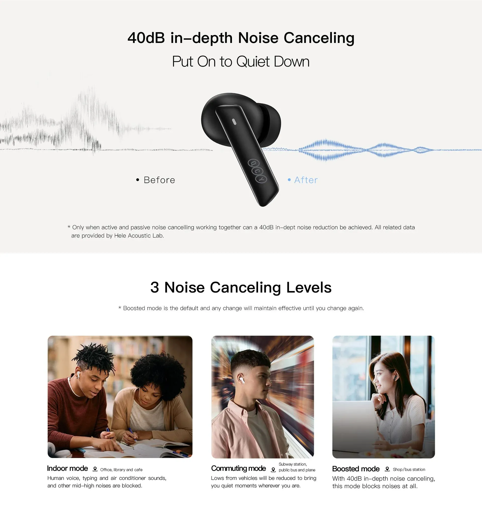Silence the world around you with up to 40dB deep Active Noise Cancellation.3 The Hybrid ANC technology effectively blocks out a wide range of ambient noise, offering you a peaceful retreat for your music, podcasts, or calls.4 Choose from three ANC modes to tailor the noise cancellation to your surroundings.5