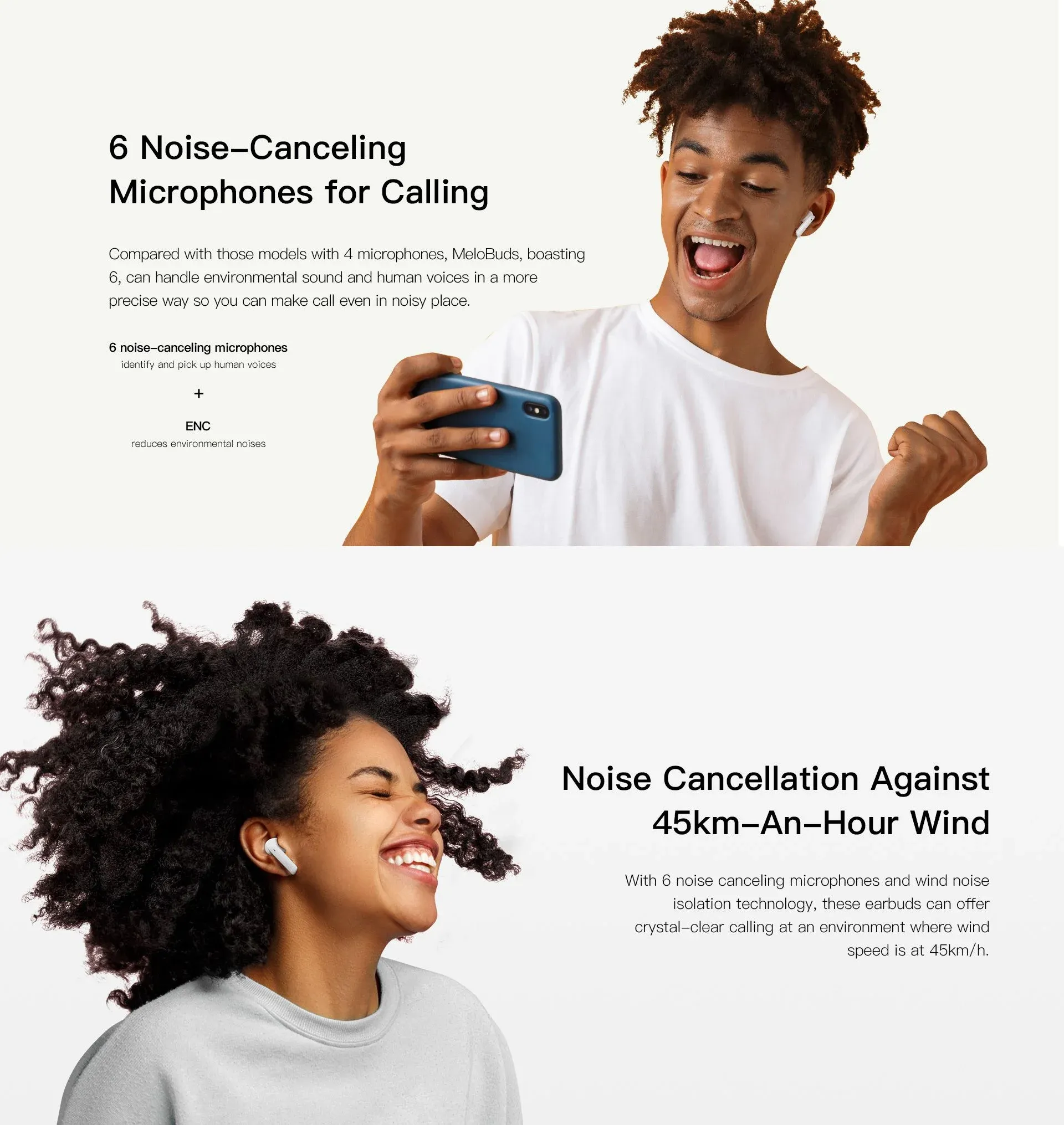 Enjoy superior call clarity, even in noisy environments.6 Equipped with a total of six microphones (three in each earbud) and advanced Environmental Noise Cancellation (ENC) technology, the QCY MeloBuds ANC HT05 True Wireless Earbuds accurately pick up your voice and suppress background noise, making your conversations feel like a face-to-face chat.7