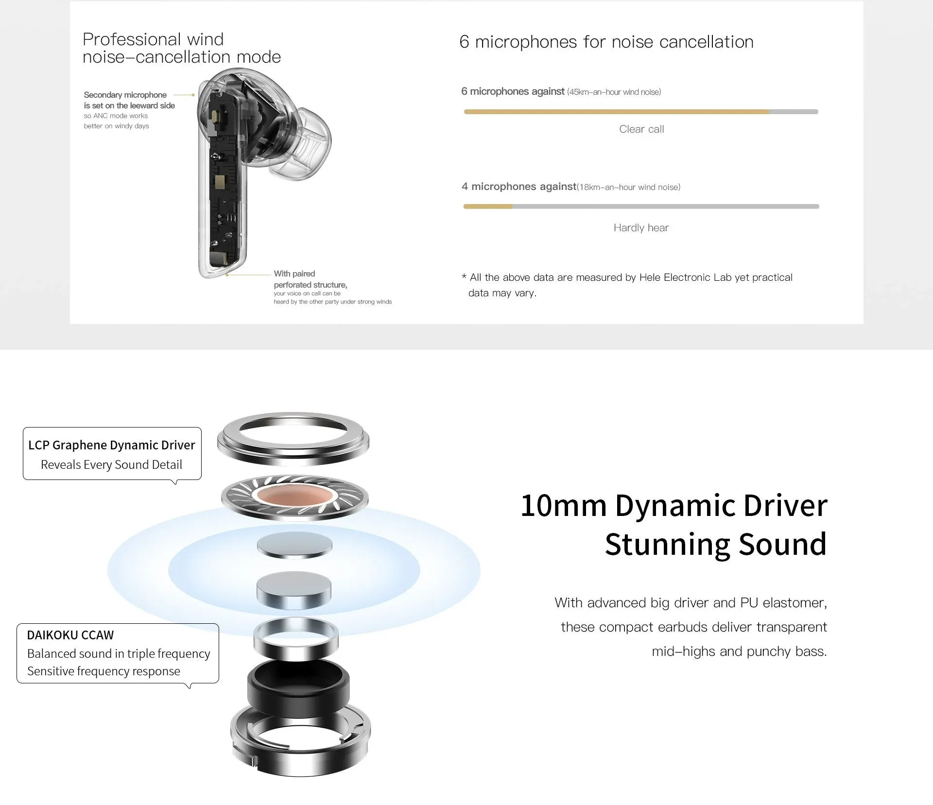 Powered by 10mm LCP (Liquid Crystal Polymer) Graphene dynamic drivers, these True Wireless Earbuds deliver stunning sound with rich bass, transparent mid-highs, and exceptional detail, ensuring a high-quality audio reproduction across all genres.8