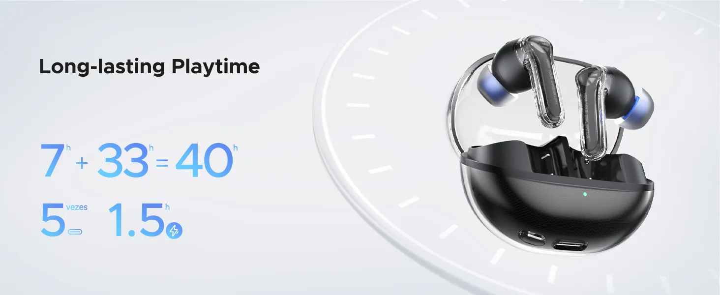 A: The earbuds provide up to 7 hours of playtime on a single charge. The charging case extends the total listening time up to an impressive 40 hours.