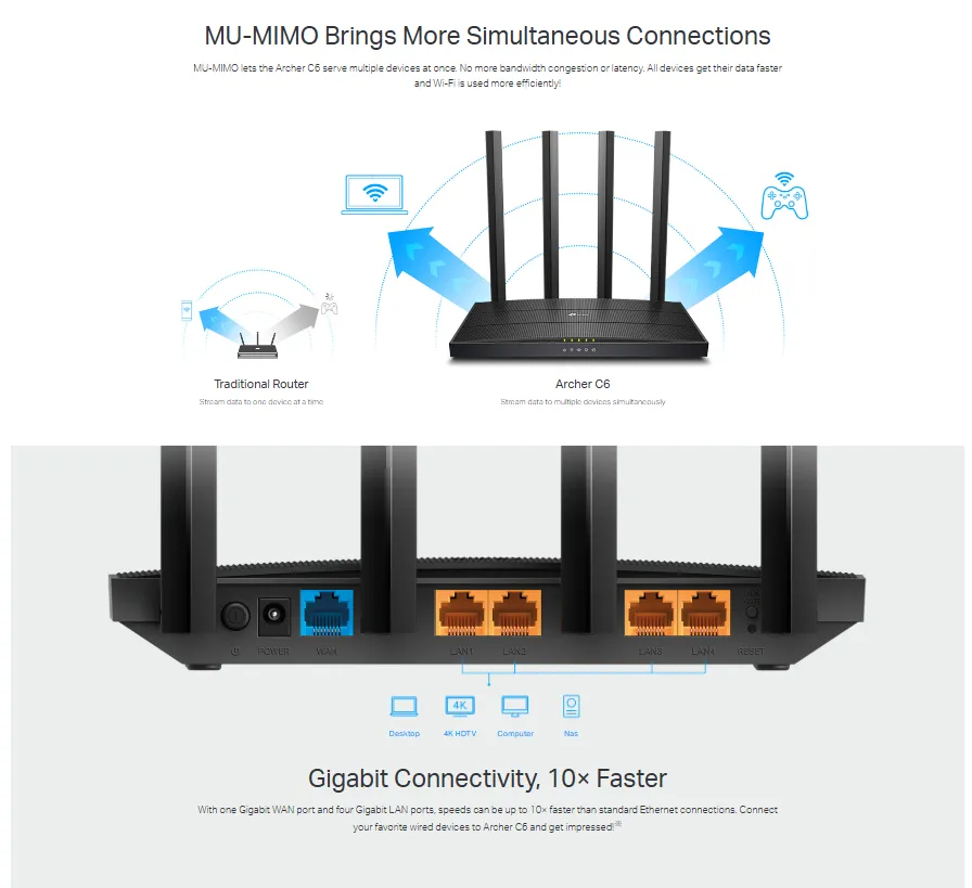 Q2: Does the Archer C6 support Gigabit internet plans? A: Absolutely. It features a Gigabit WAN port and four Gigabit LAN ports, making it ideal for internet subscriptions up to (1 Gigabit) and ensuring your wired devices (like PCs and gaming consoles) get the fastest possible speed.