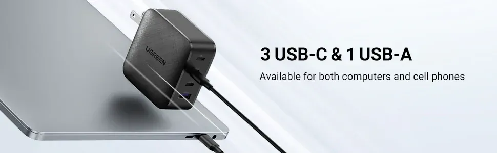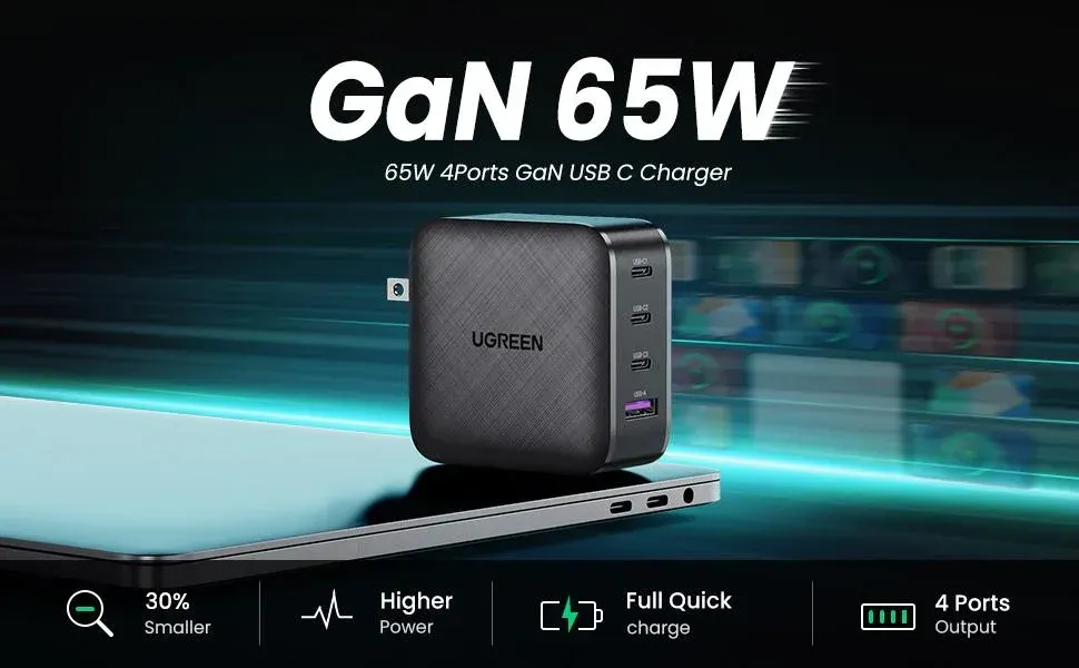 Charge all your devices at once with the UGREEN 65W PD GaN Fast Charger CD224. Designed with next-generation GaN (Gallium Nitride) technology, this compact yet powerful 4-in-1 wall charger delivers ultra-fast charging for laptops, smartphones, tablets, and more. With 2 USB-C Power Delivery (PD) ports and 2 USB-A ports, it’s the perfect solution for travel, home, or office.