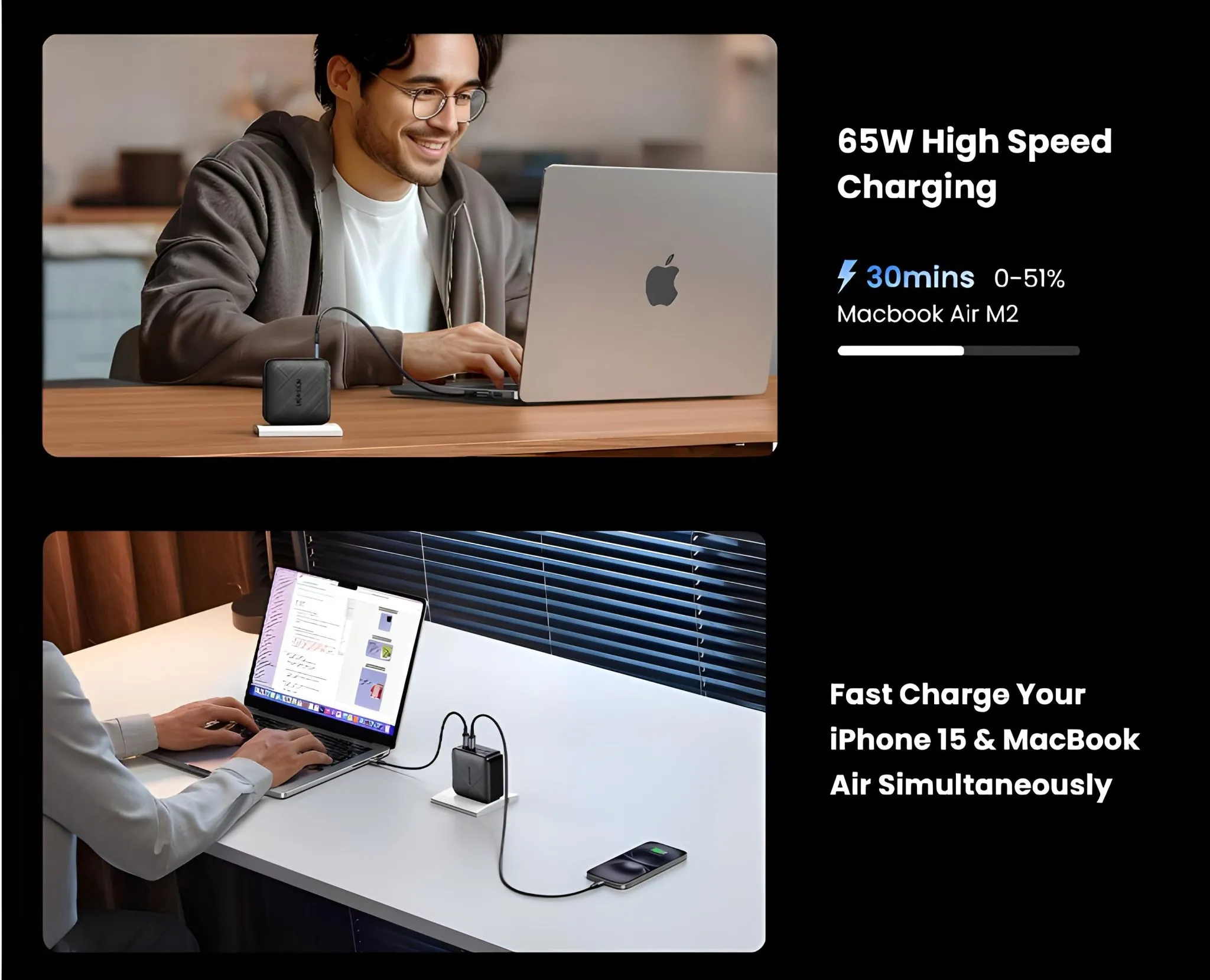65W High-Speed Charging: Quickly charges MacBook Pro, iPhone, Samsung Galaxy, iPad, and other USB-C devices.