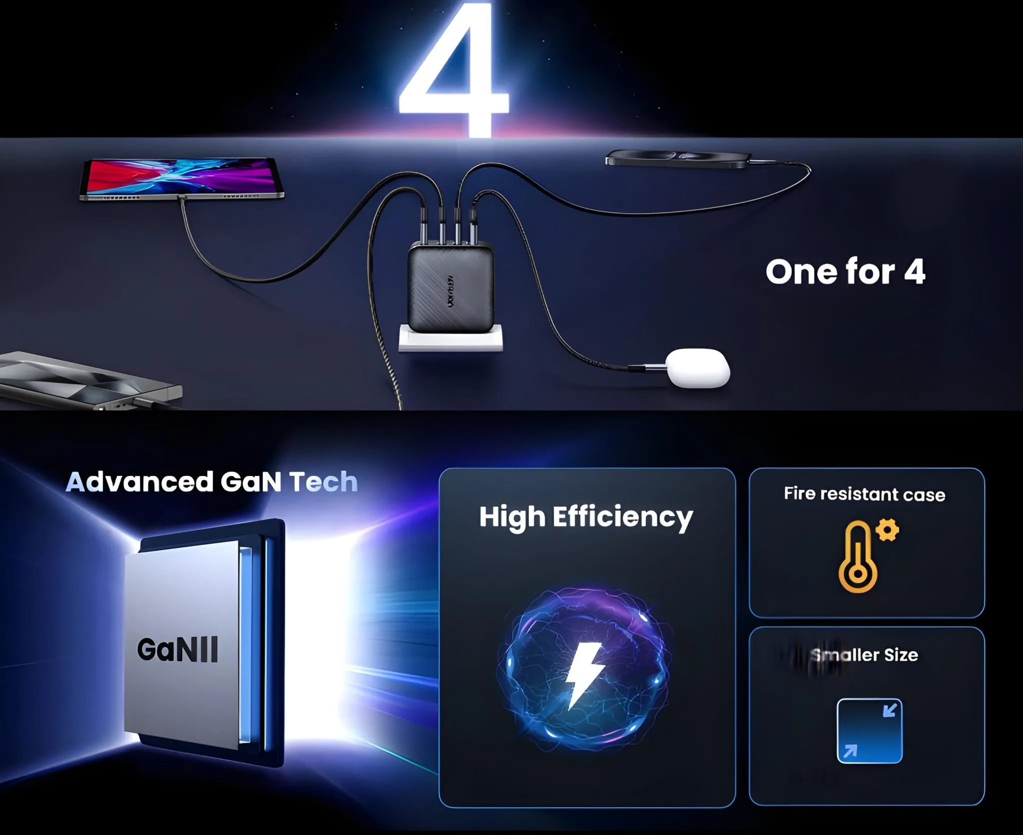 GaN Technology: Smaller, cooler, and more efficient than traditional chargers.