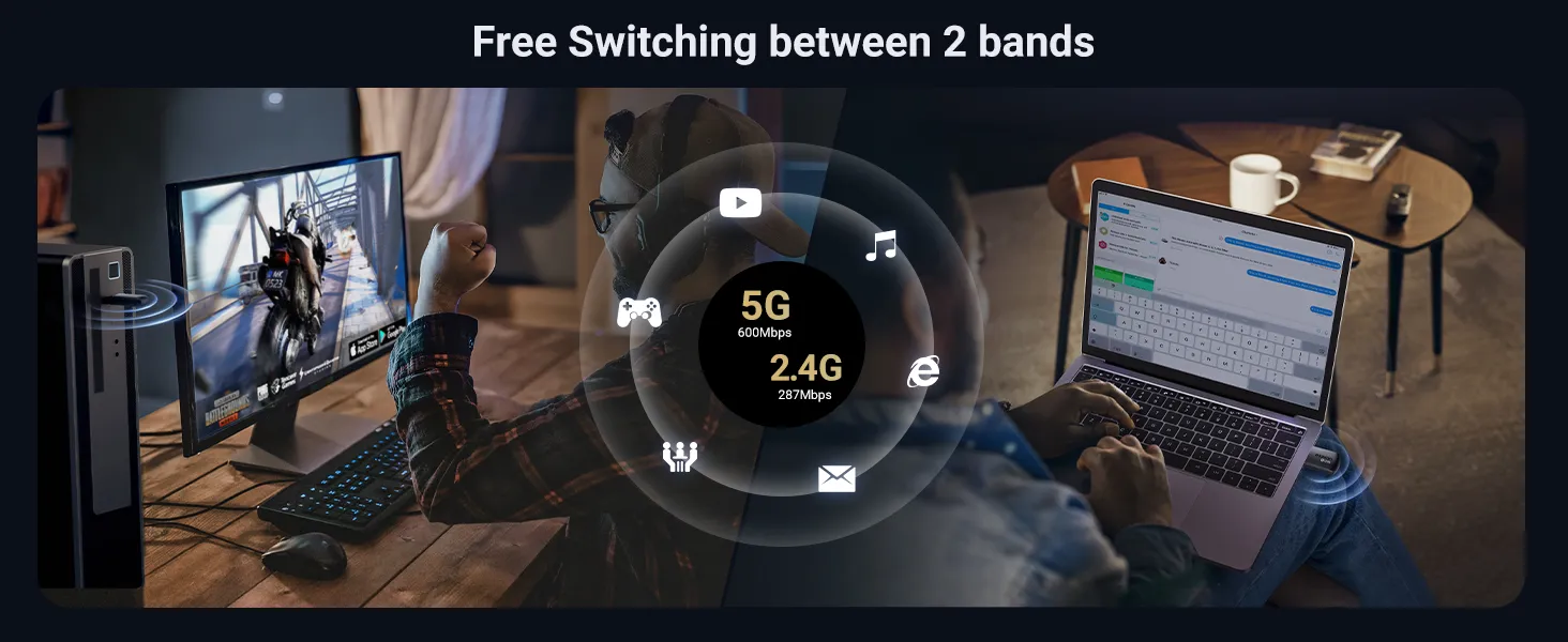 Dual Band Connectivity – Enjoy flexible 2.4GHz (300Mbps) and 5GHz (600Mbps) for optimal performance.