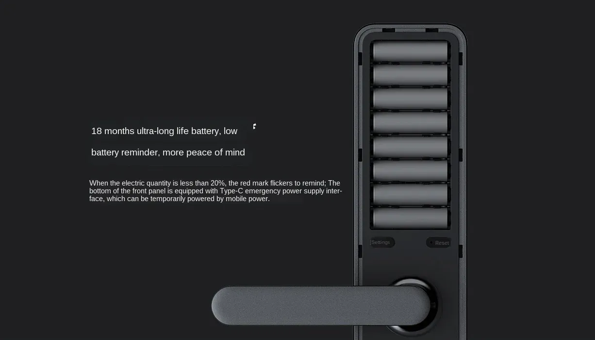 A: The lock is powered by 8 AA batteries and is designed to last up to 18 months under normal use. If the battery runs out, you can use the USB Type-C port on the front panel to connect a power bank for temporary emergency power. You can also use the physical emergency key.