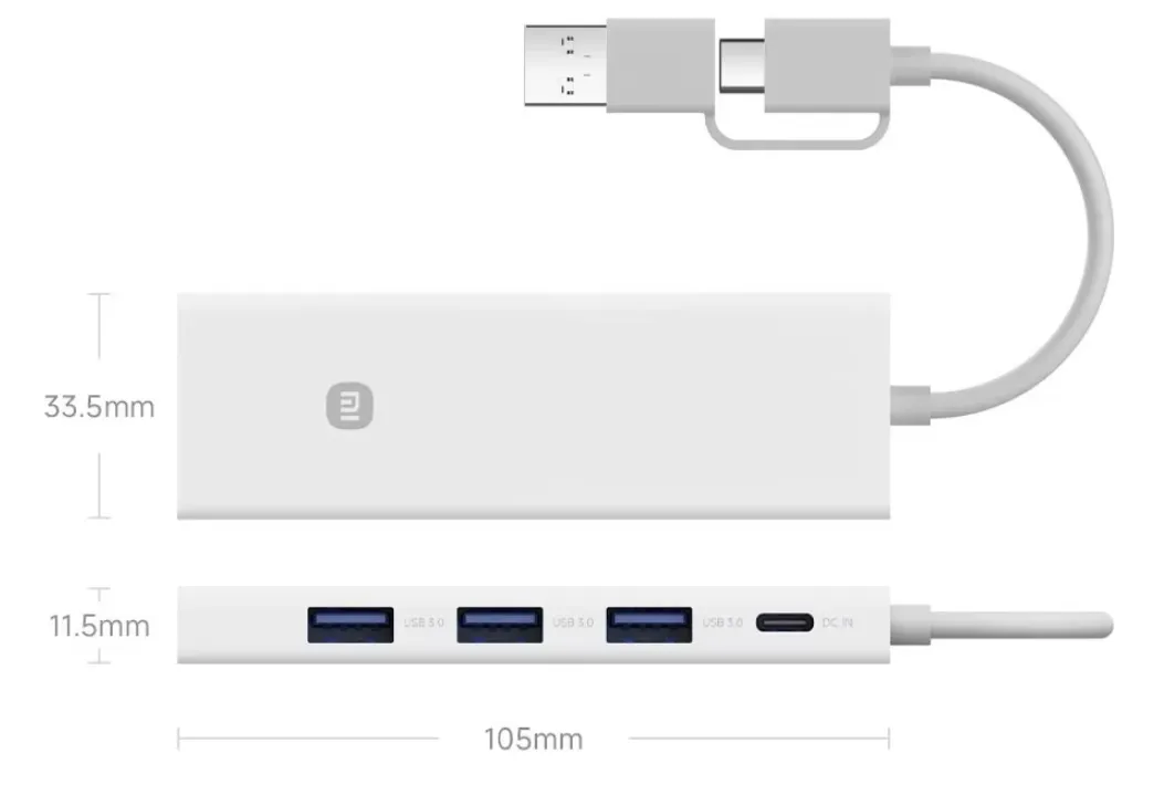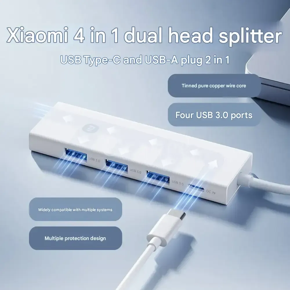 The Xiaomi Multifunctional HUB 4-in-1 Dual (XMSTFXQ01YM) is the versatile solution for expanding the connectivity of modern and legacy devices. Its key innovation is the Dual-Head Upstream Connector (featuring both USB-A and USB-C), ensuring instant compatibility with nearly any laptop, PC, tablet, or OTG-supported smartphone. This USB 3.0 SuperSpeed hub simplifies your workspace by transforming one port into four high-speed USB-A outputs.