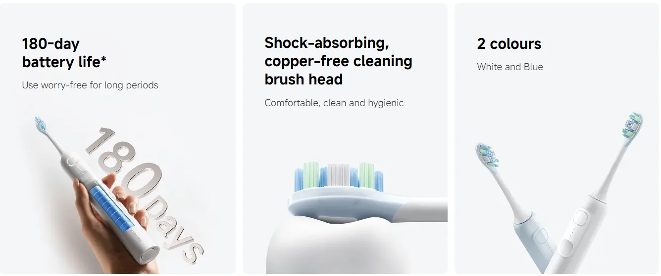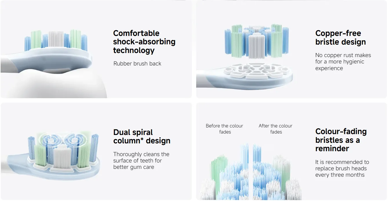 - Shock-Absorbing Brush Head: The new generation copper-free brush head features a soft rubber-coated design for cushioning, protecting your teeth and gums from uncomfortable collisions and ensuring a more hygienic experience.14